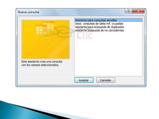 2) Existen consultas de selección, que muestran datos, y consultas de acción, que realizan cambios a los registros.