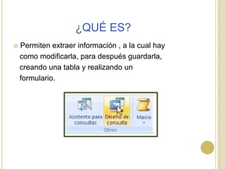Las consultas en Access permiten extraer y modificar información de una o más tablas relacionadas. Existen consultas de selección para visualizar registros, consultas de acción para insertar, modificar o eliminar datos, y consultas SQL específicas. Para crear una consulta, se seleccionan las tablas relevantes y se establecen las condiciones para filtrar los registros deseados.