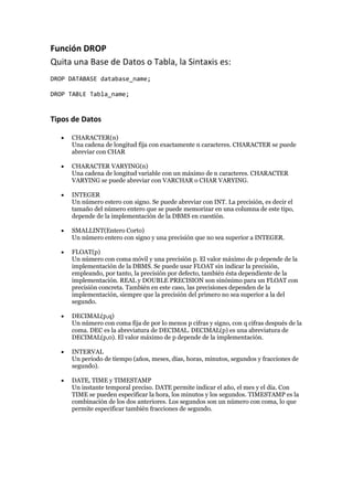 Este documento describe las funciones DROP y ALTER TABLE para eliminar y modificar tablas en una base de datos, así como los tipos de datos compatibles como CHARACTER, INTEGER, DATE y otros. También explica los conceptos de Primary Key, operadores LIKE y ORDER BY, y funciones estadísticas como COUNT, MAX, MIN, SUM y AVG, que se pueden usar con la cláusula GROUP BY para agrupar filas.