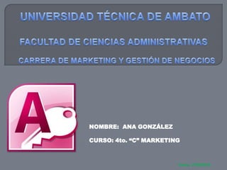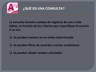 Este documento describe qué es una consulta y los pasos para crear una consulta en Access. Explica que una consulta muestra campos de registros de una o más tablas según criterios del usuario y que puede ordenar, filtrar y agregar campos calculados. Luego detalla los 7 pasos para crear una consulta y los tipos principales de consultas como de selección, acción y SQL.
