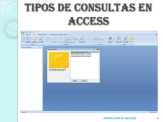 Este documento describe los diferentes tipos de consultas en Access, incluyendo consultas de eliminación, actualización, parámetros, referencias cruzadas y búsqueda de duplicados. Explica que las consultas permiten modificar múltiples registros de forma global y crear nuevas tablas a partir de datos existentes. También menciona el asistente para crear consultas sencillas de manera rápida.