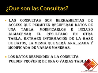 Las consultas en Access permiten recuperar y modificar datos de una o más tablas. Existen consultas de selección para extraer datos, consultas de acción para realizar cambios, y consultas SQL específicas. Para crear una consulta, se seleccionan las tablas pertinentes, los campos requeridos, y se ejecuta la consulta.