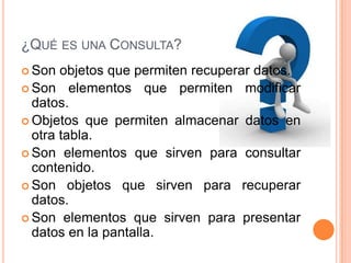 Este documento describe diferentes tipos de consultas en Access, incluyendo consultas de selección, acción y SQL. Explica que las consultas permiten recuperar, modificar y almacenar datos de tablas. Detalla los tipos de consultas de selección como seleccionar, crear tabla, anexar, actualizar, eliminar y más, y cómo cada una extrae o modifica datos de diferentes maneras.