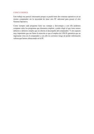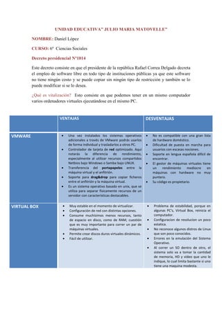 Este documento resume las ventajas y desventajas de dos programas de virtualización, VMware y VirtualBox. VMware permite ejecutar múltiples sistemas operativos en una misma máquina física y transferirlos entre computadoras. Sin embargo, no es compatible con todo el hardware y puede ser difícil de configurar. VirtualBox consume menos recursos que VMware pero puede causar problemas de estabilidad e incompatibilidad con algunas distribuciones de Linux. En general, la virtualización permite ejecutar múltiples sistemas operativos en una sola máqu