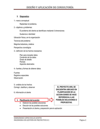 El documento describe las etapas del proceso de consultoría. Estas incluyen la iniciación para definir el problema y alcance, el diagnóstico para identificar el problema del cliente, y la planificación de acción donde se proponen posibles soluciones. Luego se aplican las soluciones y se termina el proceso tomando decisiones.