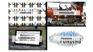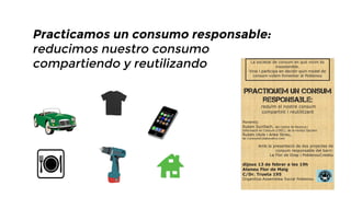 El documento discute alternativas para reducir el consumo a través del consumo colaborativo, que se redefine por la tecnología moderna. Este enfoque incluye la producción colaborativa, el conocimiento colaborativo y las finanzas colaborativas. Se enfatiza la importancia de compartir y reutilizar recursos en un contexto de consumo responsable.