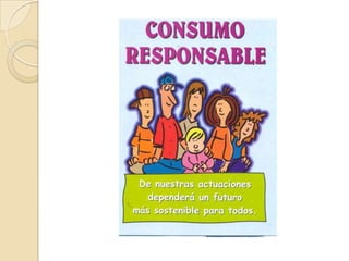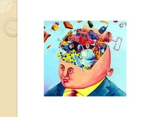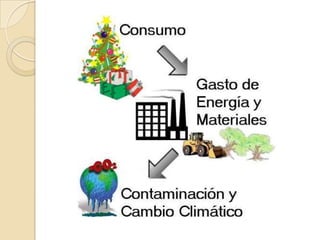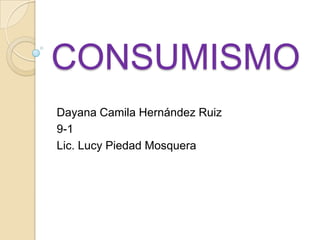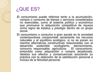 El documento habla sobre el consumismo. Explica que el consumismo se refiere a la acumulación y compra excesiva de bienes no esenciales, y al sistema que promueve la riqueza como estatus. También analiza los factores que inducen la compra, como la cultura, el estatus y la necesidad. Examina los efectos negativos del consumismo en el medio ambiente y la distribución desigual de la riqueza. Además, distingue entre consumo experimental, ocasional y habitual.