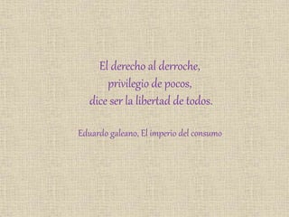 El documento discute los efectos negativos del consumismo excesivo en la sociedad y el medio ambiente. El consumismo ha llevado a la extracción insostenible de recursos naturales y ha afectado los ciclos naturales. También ha influido en los valores culturales y estilos de vida tradicionales. Sin embargo, es posible adoptar formas de consumo más sostenibles, como reducir el consumo de carne, comprar solo lo necesario y optar por productos reciclables.