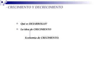 Este documento discute cinco formas de crecimiento y decrecimiento. Propone que el desarrollo debe lograrse a través de la cooperación entre humanos y la simbiosis entre humanos y la naturaleza, evitando la explotación. Critica tanto el crecimiento ilimitado como el decrecimiento extremo, abogando en cambio por tomar lo mejor de ambas posiciones para resolver problemas de manera democrática.