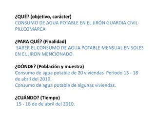 Este documento resume el consumo de agua potable en 20 viviendas del jirón Guardia Civil-Pillcomarca en abril de 2010. Se recolectaron los datos mediante encuestas y se calcularon estadísticos como la media, moda, mediana y desviación estándar. La mayoría de las viviendas tuvieron un consumo entre 14,2 a 45,2 soles, con una moda de 18,05 soles. El consumo fue heterogéneo con una desviación estándar de 8,543.