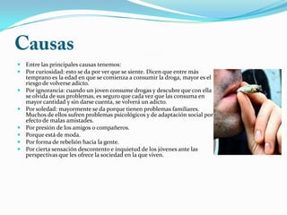 El documento describe las principales causas del consumo de drogas entre los jóvenes, incluyendo la curiosidad, ignorancia, soledad y presión de amigos. También detalla las graves consecuencias físicas y psicológicas del consumo de drogas en los adolescentes. Finalmente, enfatiza que la prevención requiere una responsabilidad compartida entre la familia y otros, con los padres educando a sus hijos sobre los peligros de las drogas y desarrollando su personalidad de manera saludable.