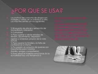 Los motivos del consumo de drogas varían entre individuos e incluyen la búsqueda de placer, la curiosidad, aliviar la tensión o ansiedad, superar la timidez, y presión de amigos o familiares. Las consecuencias de la drogadicción afectan la salud física y mental del individuo, así como su rendimiento académico y social, y pueden incluir daño al sistema nervioso, tolerancia y farmacodependencia.