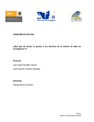El documento presenta los resultados de una encuesta realizada a estudiantes de un curso sobre sus dulces favoritos. La mayoría de los estudiantes les gustan los dulces, con el chocolate siendo el favorito. La mayoría consume de 1 a 5 dulces diarios o cada tercer día. El objetivo era conocer los tipos de dulces más populares y la frecuencia de consumo.