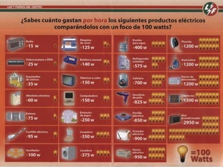 La tabla muestra el consumo de energía eléctrica de diferentes aparatos para que los usuarios puedan prevenir aumentos en sus tarifas. Se enfatiza la importancia de apagar aparatos que no se estén usando para ahorrar energía y ayudar al medio ambiente al reducir el calentamiento global. Se pide compartir esta información para que todos se beneficien de un uso más eficiente de la electricidad.