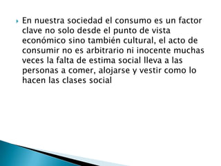 El documento discute los efectos negativos del consumismo excesivo en la sociedad y el medio ambiente. El consumismo lleva a desigualdades socioeconómicas y es una causa subyacente de problemas como la pobreza, el hambre y los movimientos migratorios. Además, el consumo excesivo de los países desarrollados está agotando los recursos naturales del planeta y creando una deuda ecológica con las naciones en desarrollo.