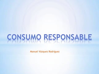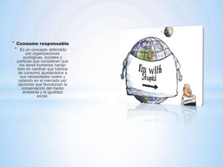 El documento habla sobre el consumo responsable, el cual es defendido por organizaciones ambientales y sociales. Se refiere a que las personas deberían cambiar sus hábitos de consumo para ajustarlos a sus necesidades reales y optar por opciones que favorezcan el medio ambiente y la igualdad social. También ofrece algunos consejos para un consumo más responsable como reflexionar antes de comprar, investigar el impacto de los productos, rechazar bolsas de plástico y favorecer el reciclaje.