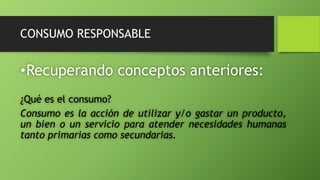 El documento aborda el concepto de consumo responsable, destacando su importancia ante el modelo de consumo actual que impulsa prácticas engañosas y explotación laboral. Se propone un cambio hacia un comercio responsable que incorpore valores éticos y sostenibles, y se enfatiza la necesidad de una actitud crítica y consciente en el consumo. También se menciona el impacto del modelo energético actual en el cambio climático y se sugieren patrones de consumo que promuevan la salud y el bienestar.