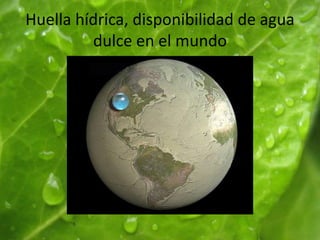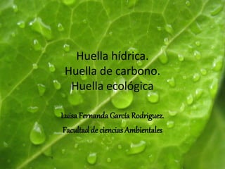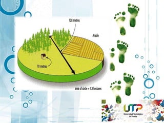 El documento presenta información sobre la huella hídrica, huella de carbono y huella ecológica. Explica que la huella hídrica mide el uso directo e indirecto de agua dulce en la producción de bienes, la huella de carbono mide las emisiones de gases de efecto invernadero, y la huella ecológica mide la cantidad de tierra necesaria para sustentar el estilo de vida y consumo de una persona. El documento concluye que estas métricas son herramientas útiles para medir los impactos