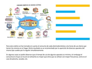 Este documento presenta un análisis del consumo energético diario de una residencia familiar de 5 miembros. Incluye una tabla detallando el consumo unitario, tiempo de uso diario y consumo total de cada electrodoméstico y aparato eléctrico en el hogar. El consumo total diario estimado asciende a aproximadamente 74,000 watts. El documento también incluye planos arquitectónicos del primer y segundo nivel de la vivienda.