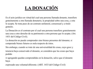 Este documento resume los principales aspectos legales de las donaciones según el Código Civil venezolano. Explica que una donación es un contrato unilateral y gratuito mediante el cual una persona transfiere la propiedad de un bien a otra que la acepta. También describe quiénes no pueden recibir donaciones, los motivos por los cuales una donación puede ser nula o revocada, y el derecho a solicitar la reducción de donaciones excesivas realizadas en los últimos 10 años de vida.
