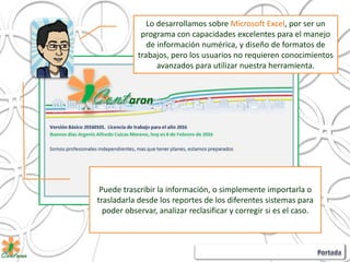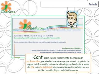Cont aran es una herramienta diseñada para capturar información relevante para declaraciones de IVA y contabilidad de empresas. Se desarrolló en Microsoft Excel para facilitar el manejo de información numérica. Permite importar datos de otros sistemas, corregir errores, y mostrar de forma inmediata los efectos de las operaciones en impuestos y contabilidad. Está diseñada para adaptarse a cambios en leyes y requerimientos formales.