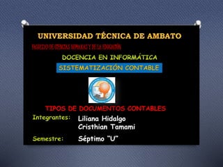 Los documentos contables son comprobantes escritos que registran las operaciones comerciales de una empresa y permiten controlar y verificar las transacciones y asientos contables. Estos documentos se clasifican en comprobantes externos, emitidos fuera de la empresa como facturas de compra, o comprobantes internos creados dentro de la empresa como facturas de venta o recibos.