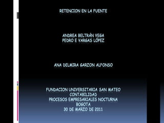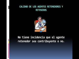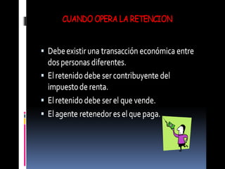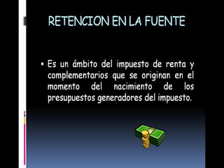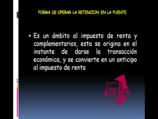 La retención en la fuente es un mecanismo de recaudación anticipada de impuestos como el IVA, ICA y renta, no un impuesto en sí. El sujeto pasivo es quien recibe el pago y es retenido, mientras que el agente retenedor es quien paga. Aunque algunas personas no estén obligadas a declarar renta, deben pagar impuestos igual al total retenido.