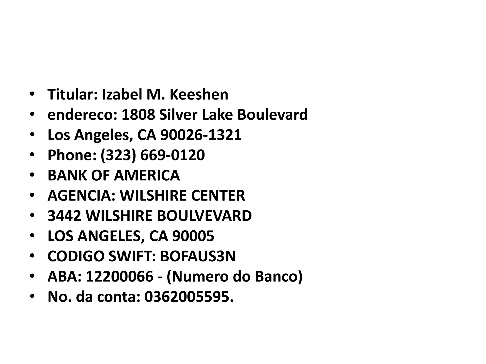 La información proporcionada incluye los detalles de contacto de Izabel M. Keeshen que vive en Los Angeles, CA, así como los detalles bancarios de su cuenta en Bank of America Wilshire Center incluyendo el número de cuenta, código SWIFT y ABA.