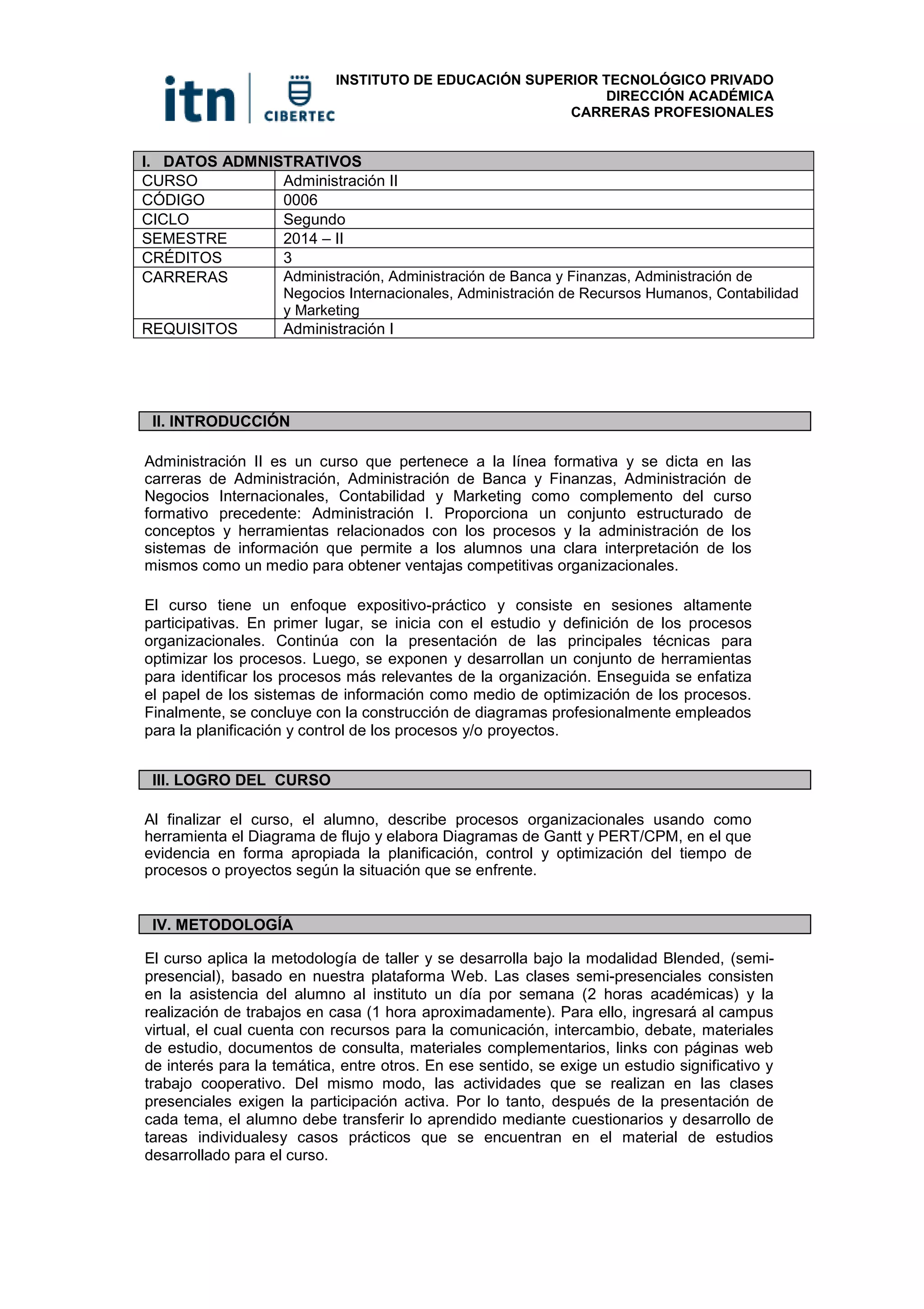 Este documento presenta información sobre el curso de Administración II dictado en varias carreras de una institución de educación superior. El curso enseña conceptos y herramientas relacionadas a los procesos y sistemas de información de una organización. El curso se centra en identificar y optimizar los procesos clave de una empresa a través de diagramas y herramientas de planificación. Al final del curso, los estudiantes podrán describir y planificar procesos y proyectos usando diagramas como flujo de trabajo, Gantt y