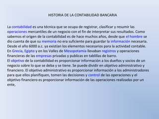 La contabilidad tiene sus orígenes en las primeras civilizaciones de Mesopotamia, Egipto y Grecia hace miles de años, donde se llevaban registros de transacciones comerciales y financieras del gobierno y empresas privadas en tablillas de barro y papiro. Los sumerios y babilonios desarrollaron tempranamente formas sofisticadas de llevar cuentas y libros de contabilidad. Los egipcios también llevaban registros contables detallados para los templos y el estado.