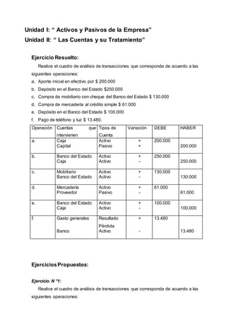 Este documento presenta varios ejercicios contables resueltos y propuestos relacionados con el análisis de transacciones y el proceso contable. Los ejercicios involucran operaciones como compras y ventas de mercaderías y activos, pagos, apertura de cuentas bancarias, préstamos y más, y el objetivo es registrar dichas transacciones en tablas contables.