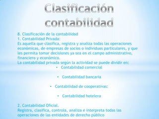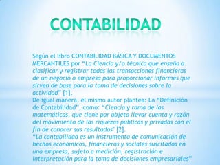 El documento define la contabilidad como la ciencia que clasifica y registra las transacciones financieras de un negocio para proveer informes que sirven de base para la toma de decisiones. También la define como la ciencia que lleva cuenta de los movimientos de riquezas públicas y privadas para conocer sus resultados. Finalmente, la describe como un instrumento para comunicar hechos económicos, financieros y sociales de una empresa para interpretarlos y tomar decisiones empresariales.