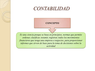 El documento habla sobre conceptos básicos de contabilidad. Explica que la contabilidad es una ciencia que permite ordenar y clasificar las transacciones financieras de una empresa para proveer informes que sirven para la toma de decisiones. También describe los campos de aplicación de la contabilidad, quiénes están obligados a llevar contabilidad, y conceptos como empresa, ciclo contable, libros contables y tipos de transacciones.