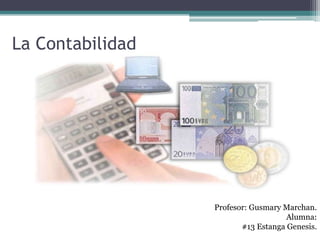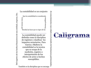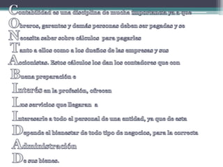 Este documento describe la contabilidad como el estudio de los fenómenos patrimoniales de una entidad a través del registro de sus transacciones financieras. Explica que la contabilidad proporciona información a los dueños, accionistas, bancos y gerentes sobre los ingresos y egresos de una empresa, y ofrece datos internos para la administración. También cubre los objetivos, principios y áreas relacionadas de la contabilidad.