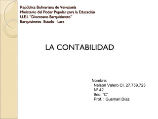 Este documento presenta información sobre la contabilidad. Explica que la contabilidad es la ciencia dedicada al estudio financiero y a la medición o el registro de los impactos monetarios de las entidades. También describe algunos de los principios básicos de la contabilidad como la entidad, el funcionamiento continuo, la prudencia y los registros. Finalmente, resalta la importancia de la contabilidad para las organizaciones al proporcionar información financiera para la toma de decisiones.