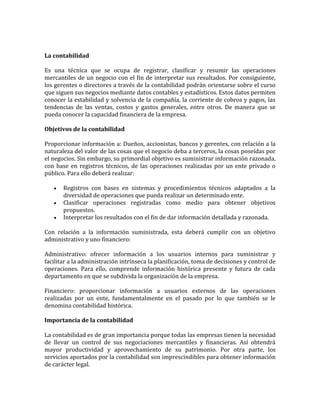 El documento provee una introducción a la contabilidad, definiéndola como un sistema para clasificar eventos económicos de un negocio. Explica que la contabilidad registra, clasifica y resume las operaciones de un negocio para interpretar sus resultados. También diferencia entre contabilidad y teneduría de libros, siendo la primera responsable del análisis y evaluación de resultados, y la segunda del registro de operaciones. Finalmente, concluye que la contabilidad ha evolucionado desde métodos simples a procesos y técnicas más avanzadas para cu