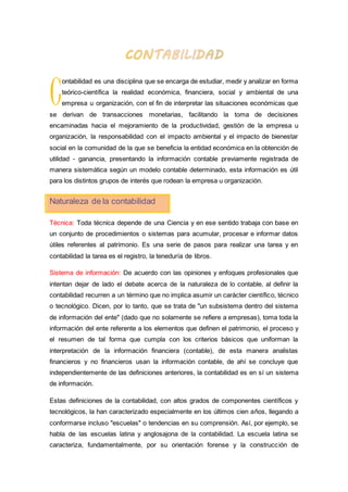ontabilidad es unadisciplina que se encarga de estudiar, medir y analizar en forma teórico-científica la realidad económica, financiera, social y ambiental de una empresa u organización, con el fin de interpretar las situaciones económicas que se derivan de transacciones monetarias, facilitando la toma de decisiones encaminadas hacia el mejoramiento de la productividad, gestión de la empresa u organización, la responsabilidad con el impacto ambiental y el impacto de bienestar social en la comunidad de la que se beneficia la entidad económica en la obtención de utilidad - ganancia, presentando la información contable previamente registrada de manera sistemática según un modelo contable determinado, esta información es útil para los distintos grupos de interés que rodean la empresa u organización. Naturaleza de la contabilidad Técnica: Toda técnica depende de una Ciencia y en ese sentido trabaja con base en un conjunto de procedimientos o sistemas para acumular, procesar e informar datos útiles referentes al patrimonio. Es una serie de pasos para realizar una tarea y en contabilidad la tarea es el registro, la teneduría de libros. Sistema de información: De acuerdo con las opiniones y enfoques profesionales que intentan dejar de lado el debate acerca de la naturaleza de lo contable, al definir la contabilidad recurren a un término que no implica asumir un carácter científico, técnico o tecnológico. Dicen, por lo tanto, que se trata de "un subsistema dentro del sistema de información del ente" (dado que no solamente se refiere a empresas), toma toda la información del ente referente a los elementos que definen el patrimonio, el proceso y el resumen de tal forma que cumpla con los criterios básicos que uniforman la interpretación de la información financiera (contable), de esta manera analistas financieros y no financieros usan la información contable, de ahí se concluye que independientemente de las definiciones anteriores, la contabilidad es en sí un sistema de información. Estas definiciones de la contabilidad, con altos grados de componentes científicos y tecnológicos, la han caracterizado especialmente en los últimos cien años, llegando a conformarse incluso "escuelas" o tendencias en su comprensión. Así, por ejemplo, se habla de las escuelas latina y anglosajona de la contabilidad. La escuela latina se caracteriza, fundamentalmente, por su orientación forense y la construcción de C
