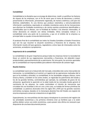 La contabilidad es la disciplina que registra y cuantifica las transacciones económicas de una entidad para medir su riqueza y facilitar la toma de decisiones. Produce estados financieros que resumen la situación económica y financiera de la empresa. Sus conceptos básicos incluyen activos, pasivos, capital, ingresos y egresos. La contabilidad surgió con el comercio y ha evolucionado para satisfacer las necesidades de información de las empresas modernas.
