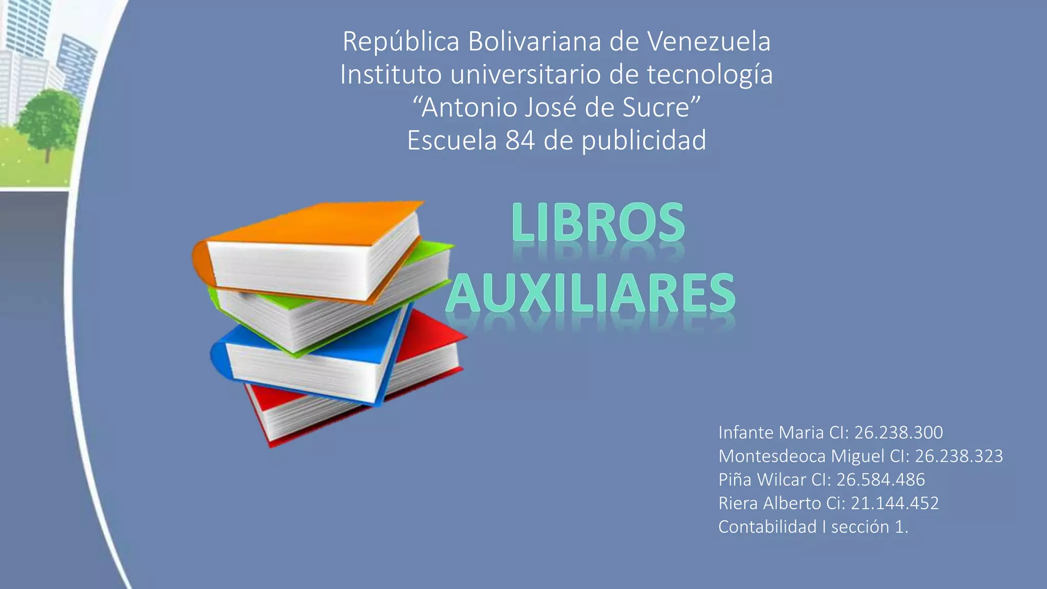 Los libros auxiliares son libros donde se registra de forma analítica y detallada la información de los libros principales. Existen varios tipos de libros auxiliares como los de inventario, compra y venta, cuentas por cobrar y pagar, y bancos. Los libros auxiliares permiten ampliar la información de los libros principales y sustentar sus registros de manera detallada.