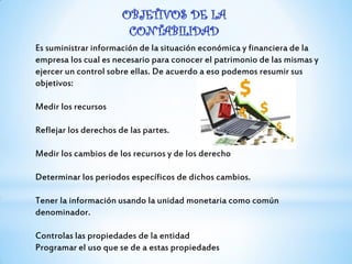 La contabilidad cuantifica, mide y analiza la realidad económica de las organizaciones para facilitar la dirección y el control. Registra transacciones y cambios económicos para proveer información útil a los usuarios en la toma de decisiones. Los profesionales de contabilidad pueden trabajar en el sector público o privado en áreas como gestión, consultoría, banca, auditoría y más.