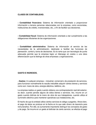 La contabilidad es un sistema para clasificar los hechos económicos de un negocio y proporcionar información sobre su situación financiera y patrimonio. Se aplica tanto en empresas públicas como privadas. Existen tres tipos de contabilidad: financiera, fiscal y administrativa. La contabilidad registra gastos e ingresos, así como aportaciones de capital de los socios o accionistas. Incluye documentos contables como facturas, recibos y cheques, y libros principales como el diario y el mayor.