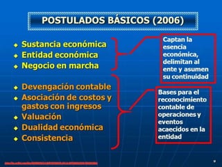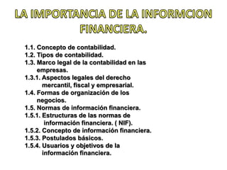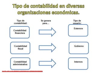 El documento trata sobre los conceptos básicos de la contabilidad como técnica para registrar las operaciones financieras de una empresa. Explica los tipos de contabilidad, el marco legal que rige esta área y las normas de información financiera. También define las diferentes formas de organización empresarial como sociedades mercantiles, civiles y empresas individuales, y establece los requisitos de llevar contabilidad según la legislación mexicana.