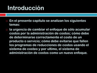1) El documento analiza los sistemas de información administrativa contemporáneos, incluyendo el sistema de administración de costos. 2) El sistema de administración de costos integra módulos de costos directos, costeo basado en actividades, análisis de rentabilidad y atractividad. 3) El objetivo del costeo basado en actividades es identificar todas las actividades de una organización para facilitar las decisiones administrativas.