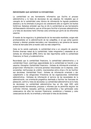 La contabilidad estudia, mide y analiza el patrimonio de las empresas para servir a la toma de decisiones y control mediante la presentación sistemática y útil de la información registrada. Provee información cuantitativa y valiosa expresada en unidades monetarias sobre las transacciones y eventos económicos de las entidades para facilitar la toma de decisiones. Es fundamental en la actualidad debido al desarrollo tecnológico, la economía cambiante y el crecimiento de las empresas.