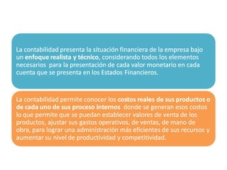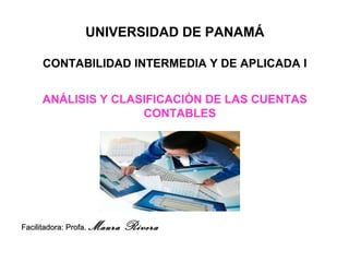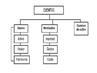 Este documento presenta información sobre la clasificación de cuentas contables y el análisis de transacciones. Explica que las cuentas se clasifican en cuentas de activo, pasivo, capital y resultados. También describe los principios básicos de la partida doble y el proceso de registrar transacciones mediante asientos contables, identificando qué cuentas se afectan y cómo cambian.