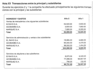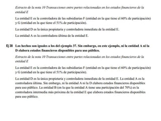 El documento proporciona información sobre la Norma Internacional de Información Financiera 3 "Combinaciones de Negocios". Define el tratamiento contable y las revelaciones necesarias para aplicar la norma. Explica que una combinación de negocios implica que una entidad obtiene el control de otra u otras entidades. El método de contabilización requerido es el método de adquisición, el cual valúa los activos y pasivos adquiridos a su valor razonable. También se detallan los conceptos clave involucrados y los pasos para medir el cost