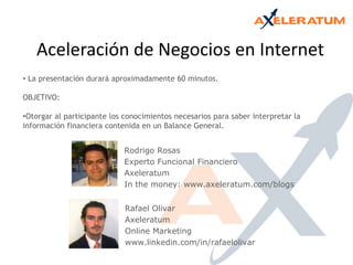 Este documento explica qué es y para qué sirve el Balance General. El Balance General muestra la estructura financiera de una empresa mediante dos bloques principales: el Activo, que son los recursos y bienes con los que cuenta la empresa, y el Pasivo, que representa los medios con los que se están financiando las operaciones de la empresa. El Balance General provee información sobre la liquidez, apalancamiento y solvencia de una compañía en un momento dado y debe analizarse comparando la composición del Activo y Pasivo con empresas líderes en el mismo sector.