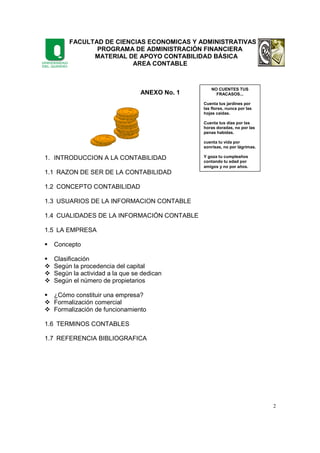 Este documento presenta información sobre contabilidad básica. Explica que la contabilidad es un sistema de información que recopila y analiza las operaciones de una empresa para comunicar los resultados a los usuarios internos y externos. Define conceptos clave como empresa, usuarios de la información contable, cualidades de la información contable como comprensibilidad y utilidad. También diferencia los tipos de empresas según su constitución legal y actividad.