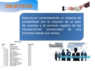 Este documento presenta los objetivos, competencias, contenido, metodología y evaluación de un curso de contabilidad. El objetivo principal es estructurar correctamente un sistema de contabilidad mediante la creación de un plan de cuentas y el registro adecuado de las transacciones comerciales de una empresa. Los temas clave que se cubrirán incluyen plan de cuentas, ciclo contable, balance inicial, libro diario y libro mayor. La evaluación constará de participación en clase, dos pruebas parciales, trabajos de investigación y una