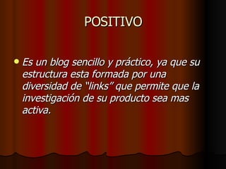El documento habla sobre un blog de contabilidad. El blog tiene una estructura sencilla con múltiples enlaces que permiten una investigación activa. Sin embargo, su simplicidad también significa que su contenido amplio no se explora completamente. El blog permite explorar la contabilidad de un modo no tradicional.